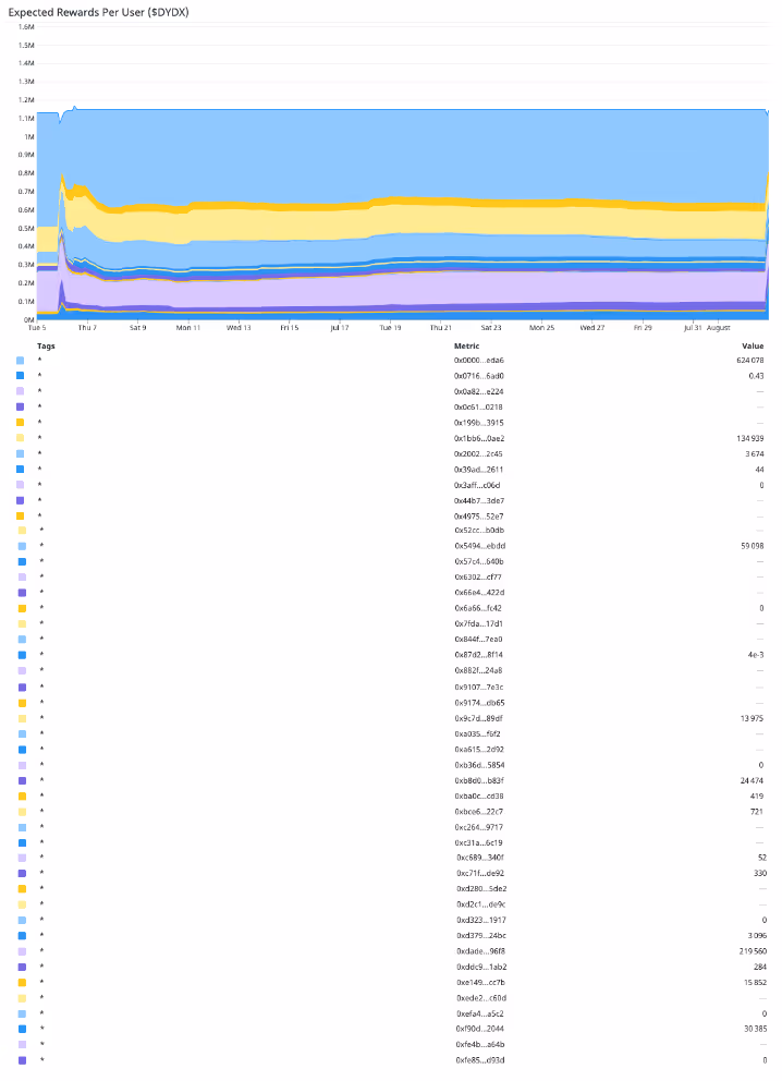 1,150,685 $DYDX were earned over the course of Epoch 12 and will be distributed to 50 addresses that were eligible for LP rewards in Epoch 12. Competition in the pool increased significantly compared to the previous epoch.
