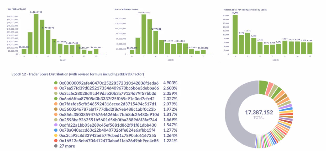 35.4M $DYDX from 3,043 users was staked to the Safety Module. This is an increase from Epoch 11 where 34.5M $DYDX was staked. The top 2 stakers account for over 33% of staked $DYDX. 195 users requested to withdraw before the Blackout Period in Epoch 12. These inactive DYDX funds can now be withdrawn and are no longer earning DYDX rewards. Users must request to withdraw their funds before the Epoch 13 Blackout Window (last 14 days of the epoch) to withdraw their funds starting in Epoch 14. Learn more about the trading rewards program in our documentation, or our recent blog posts.