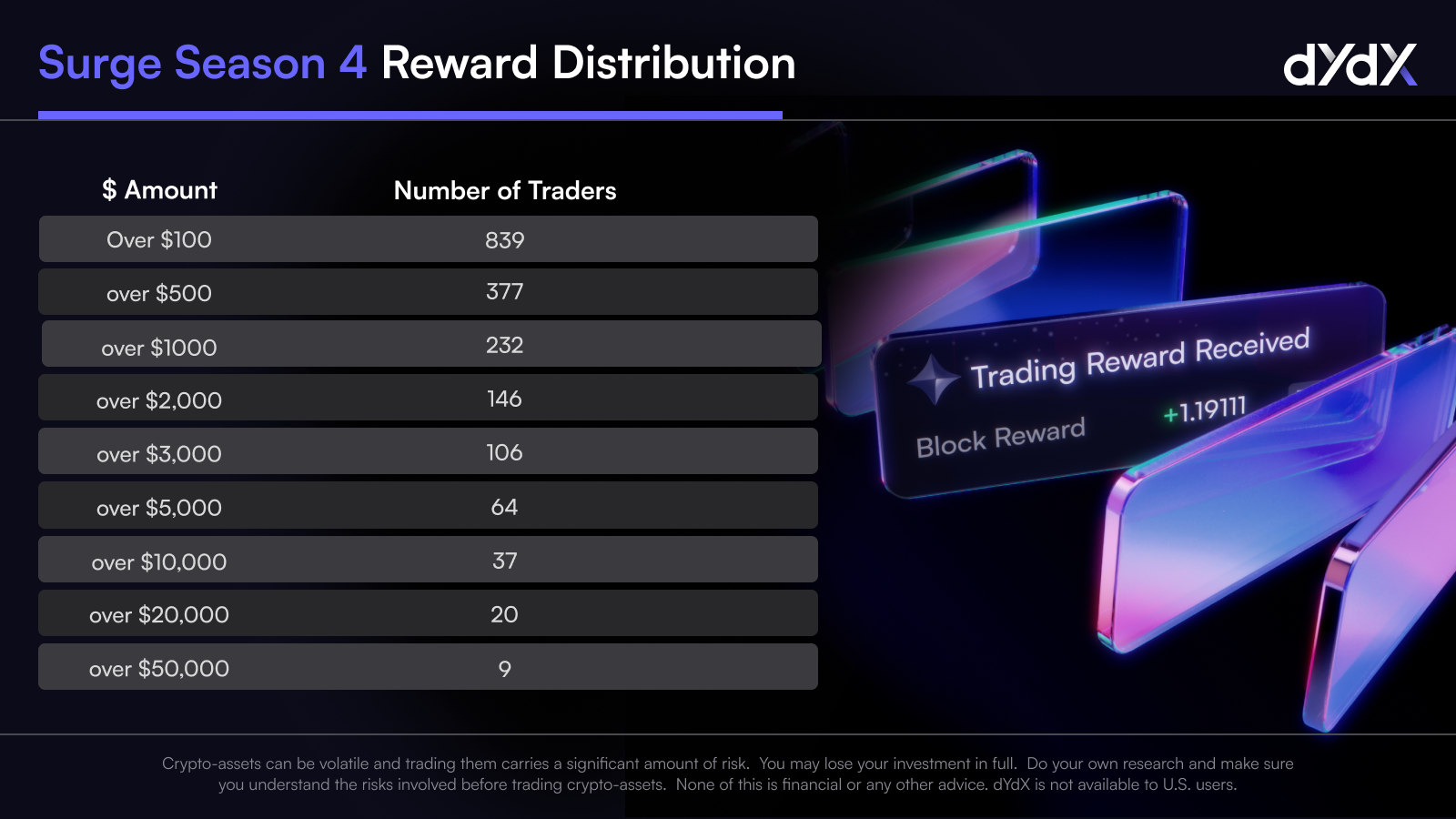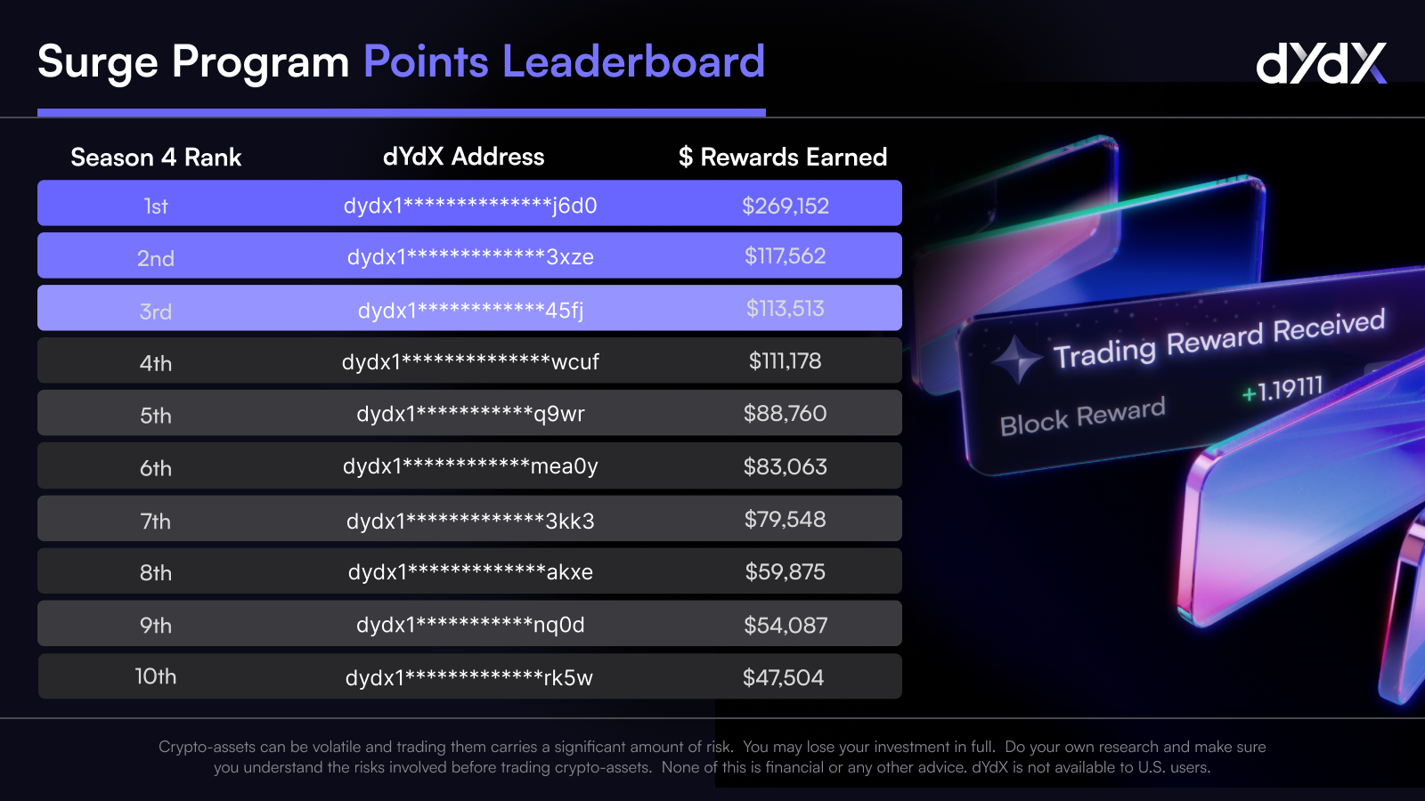 Season 4 of the dYdX Surge program concluded last month with 2.377 million DYDX (≈ $1.50M USD) distributed to 1,969 traders on dYdX. The season reinforced Surge’s role as both a competitive arena for high-volume traders and a consistent reward engine for active participants across the spectrum - laying the groundwork for even greater opportunities in Season 5 and upcoming seasons.
