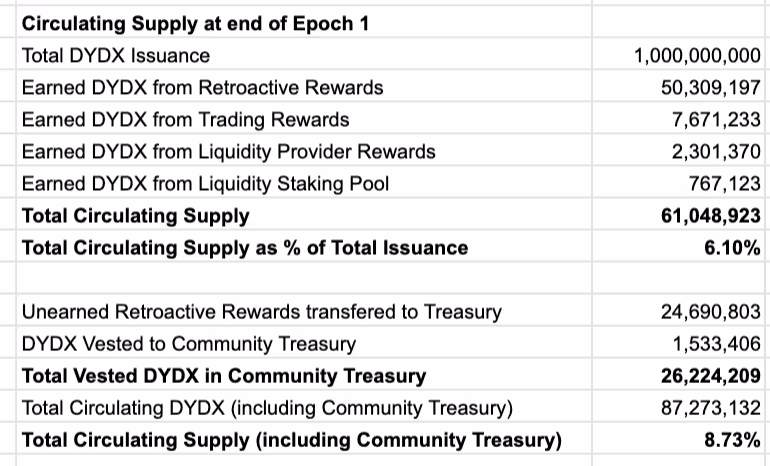 - 6.10% of the total $DYDX supply (excluding unearned Retroactive Rewards transferred to the Treasury and the $DYDX vested in the Community Treasury) is considered liquid at the end of Epoch 1.