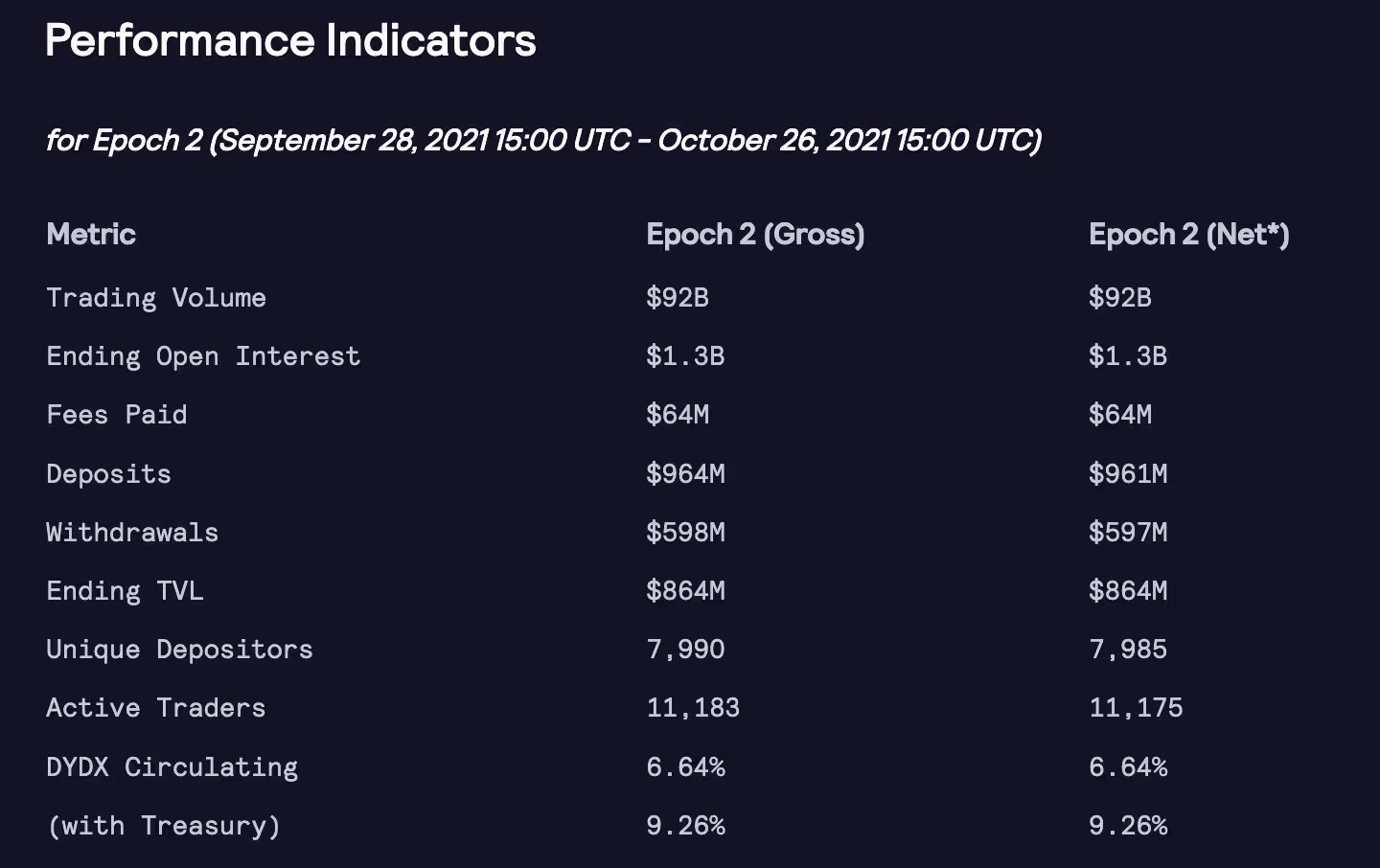 - 6.64% of the total $DYDX supply (excluding unearned Retroactive Rewards transferred to the Treasury and the $DYDX vested in the Community Treasury) is considered liquid at the end of Epoch 2.