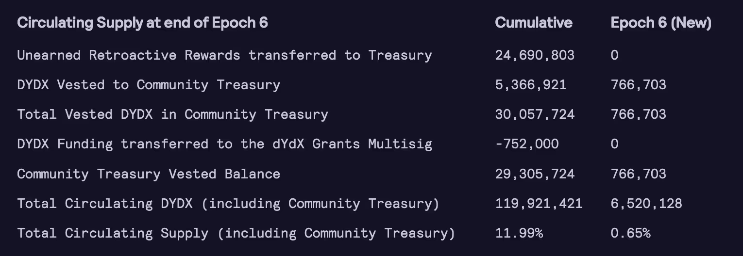 Approximately 766,703 $DYDX vested in the Community Treasury over the course of Epoch 6. The Community Treasury now holds 29,305,724 vested $DYDX tokens.