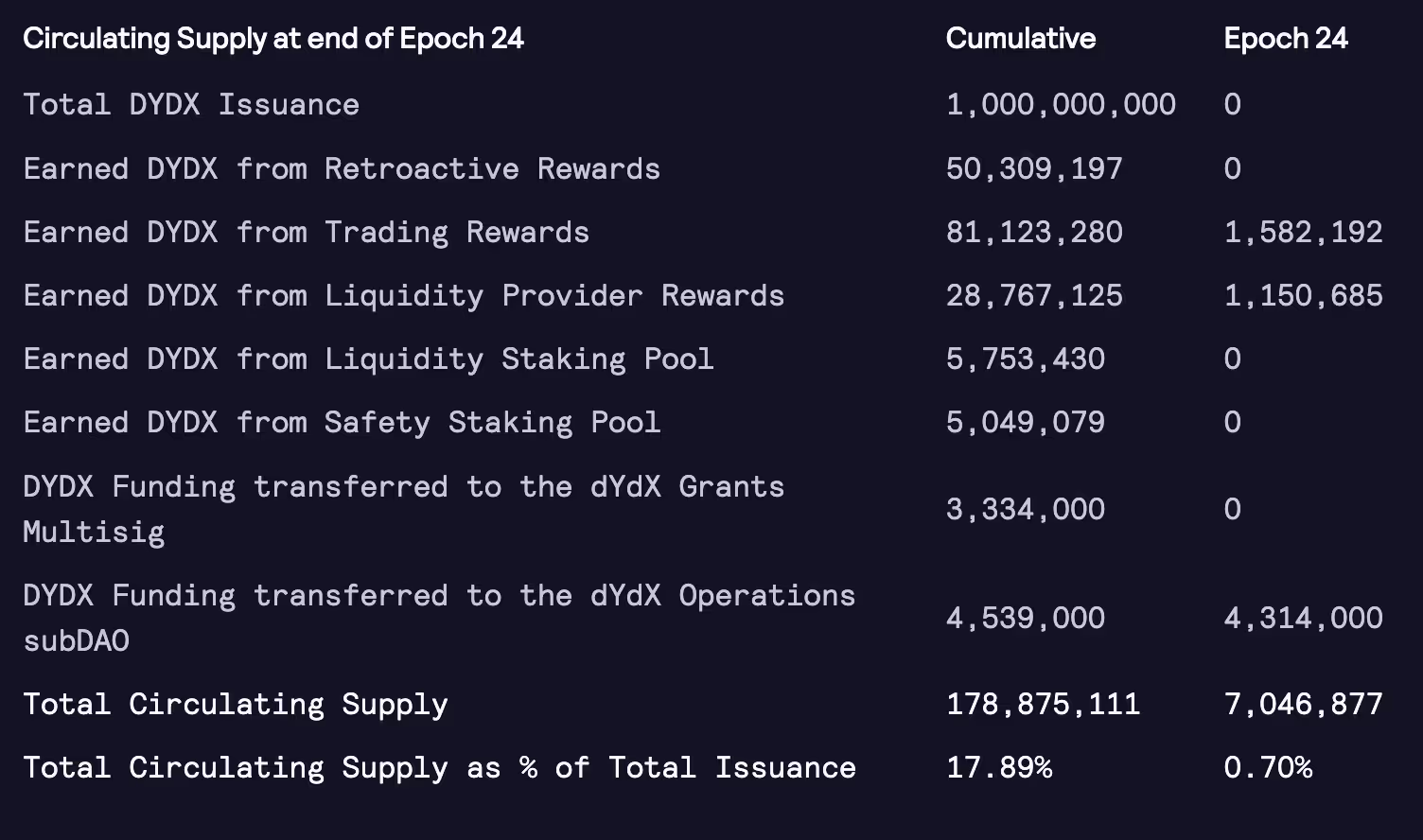 17.89% of the total $DYDX supply (excluding unearned Retroactive Rewards transferred to the Treasury and the $DYDX vested in the Community Treasury) is considered liquid at the end of Epoch 24. Learn more about the $DYDX allocation in our documentation.